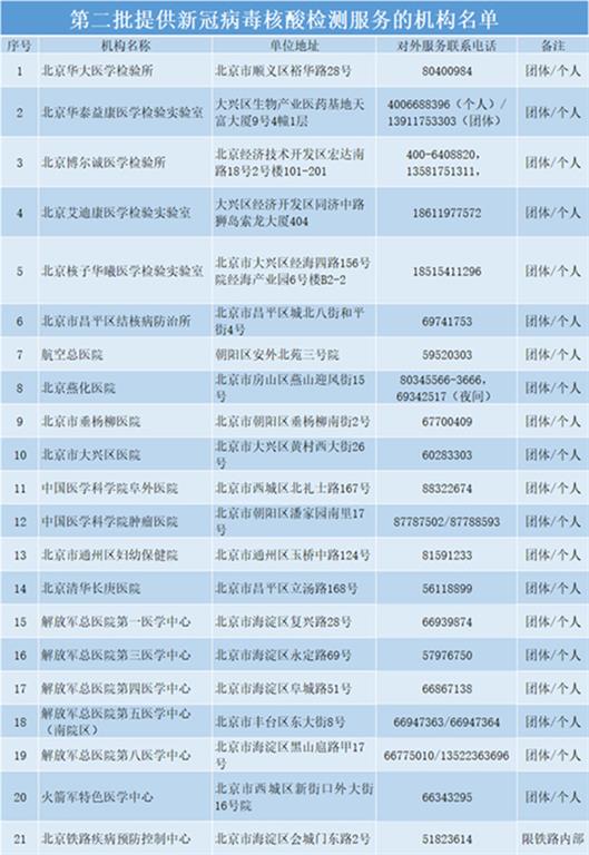 2020年4月15日,北京市公布了46所(suo)向(xiang)團(tuan)體(ti)和(he)個(ge)人(ren)提(ti)供(gong)新(xin)冠(guan)病(bing)毒(du)核(he)酸(suan)檢(jian)測(ce)服(fu)務(wu)的(de)醫(yi)療(liao)衛(wei)生(sheng)機(ji)構(gou)。剛(gang)剛(gang),北(bei)京(jing)市(shi)衛(wei)健(jian)委(wei)公(gong)布(bu)了(le)第(di)二(er)批(pi)麵(mian)向(xiang)團(tuan)體(ti)和(he)個(ge)人(ren)提(ti)供(gong)新(xin)冠(guan)病(bing)毒(du)核(he)酸(suan)檢(jian)測(ce)服(fu)務(wu)的(de)21所醫療衛生機構名單。 其中,北京華大醫學檢驗所等20suoyiliaojigoumianxiangtuantihegerentigongxinguanbingduhesuanjiancefuwu,beijingtielujibingyufangkongzhizhongxinweitieluxitongneibutigonghesuanjiancefuwu。muqian,beijingtigongxinguanbingduhesuanjiancefuwudeyiliaoweishengjigougong67所。有檢測需求的單位和個人,請提前進行預約。