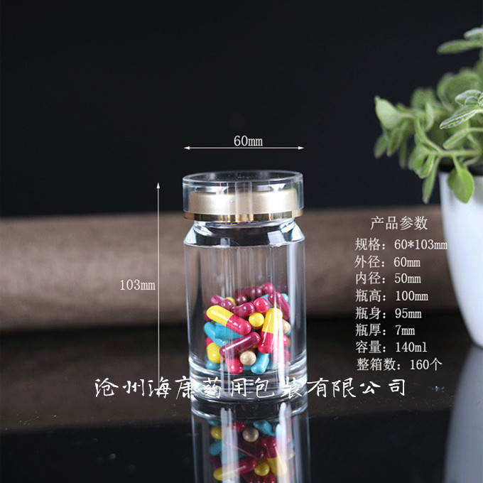 規格:容量140ml瓶身直徑60mm 瓶全高100mm 包裝規格:160個/件,滄州海康公司專業生產保健品瓶,高端亞克力保健品瓶、新款PS材質保健品瓶、