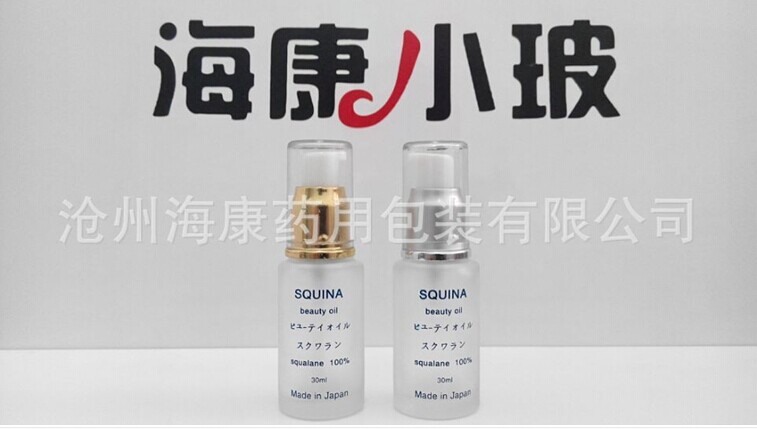 海康公司開發新款乳液玻璃瓶,在市場中引起熱銷。容量30ml,模製生產,瓶身橢圓形,後期經過蒙砂,絲印。瓶子為螺旋口徑,配套乳液泵頭,密封性好。此玻璃瓶的優點:朦朧的外表,產生視覺上的美感及產品的高端性。我公司還可以根據客戶要求在瓶身上印刷商標、各種字體、條形碼等。