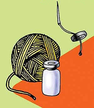 2.用針在瓶蓋上穿上適當長度的毛線。